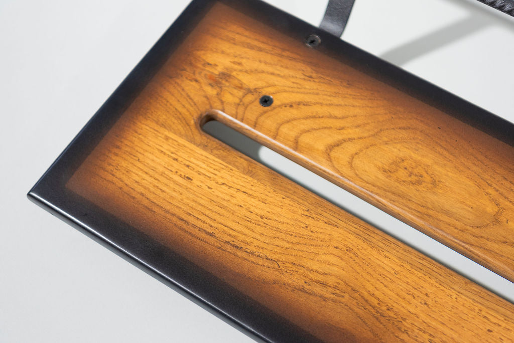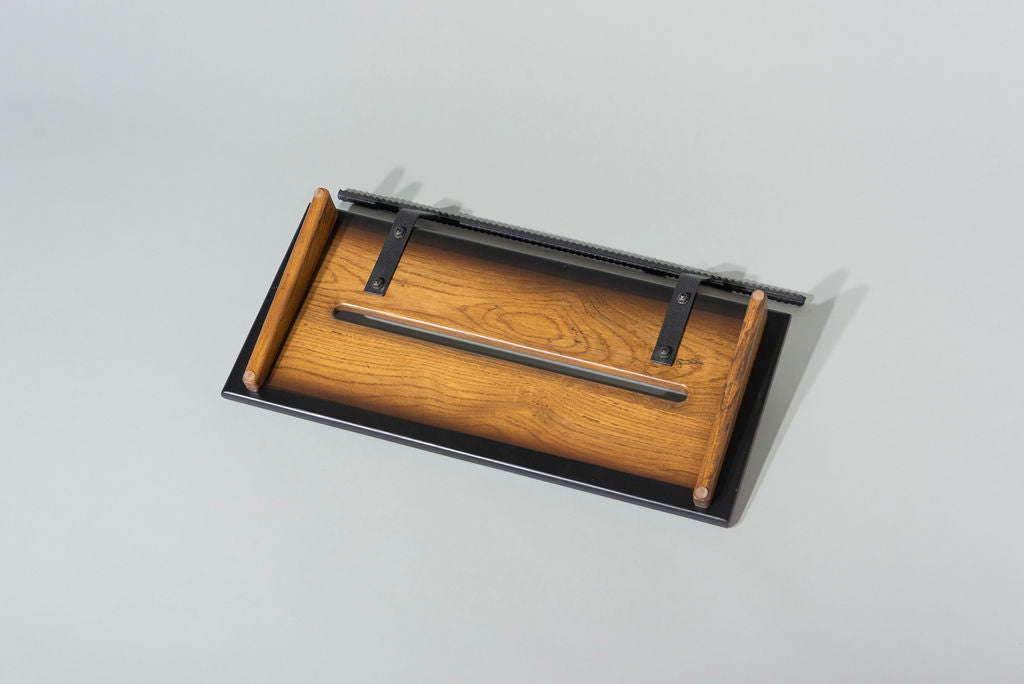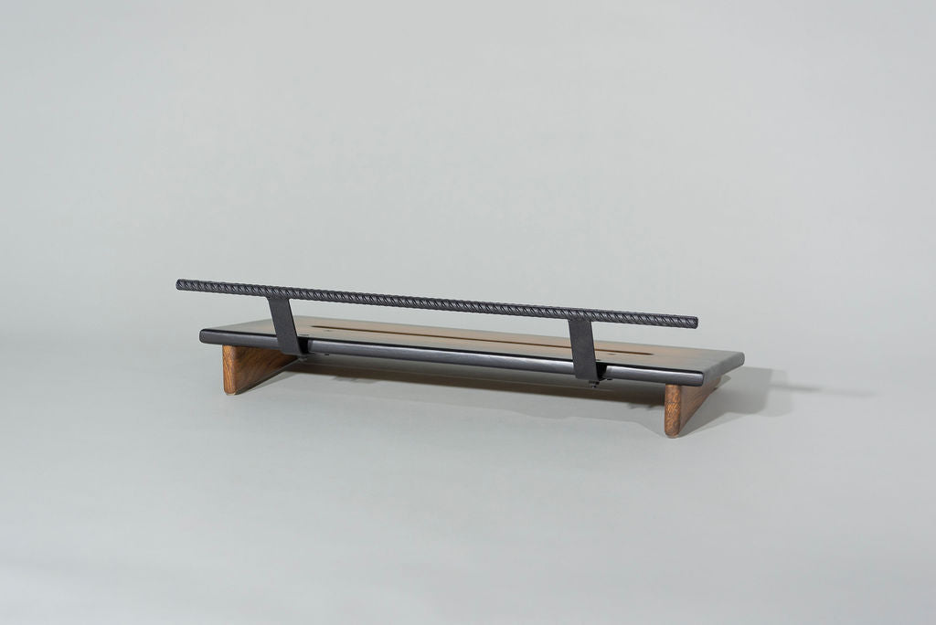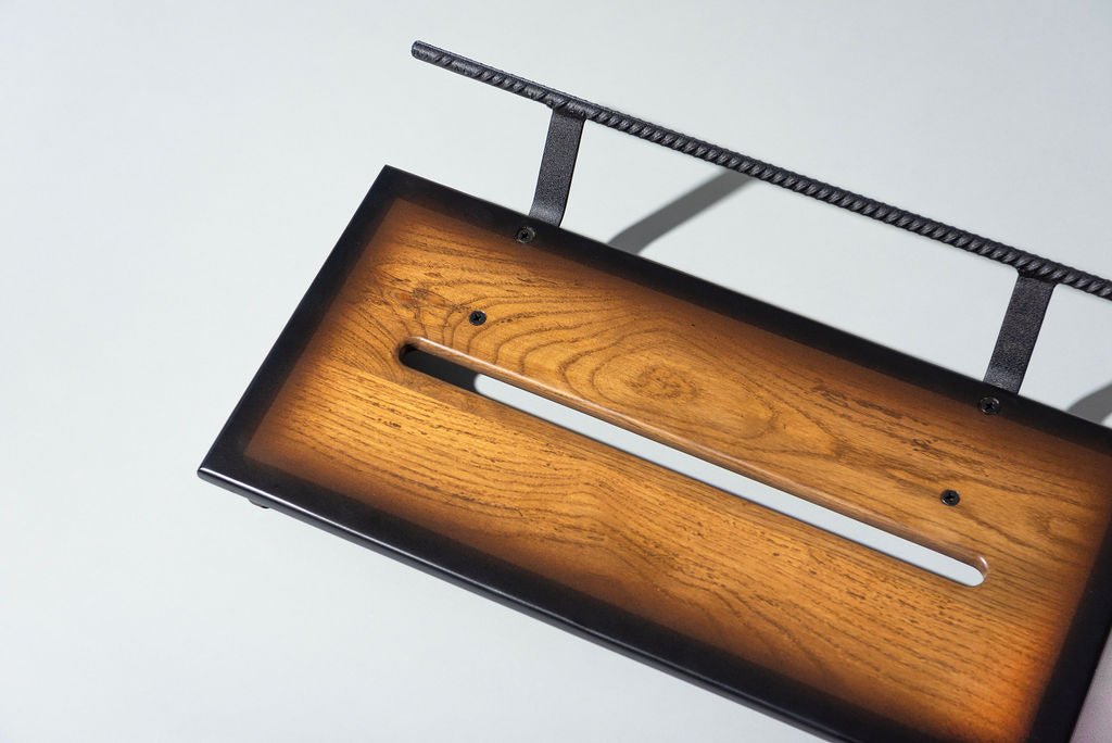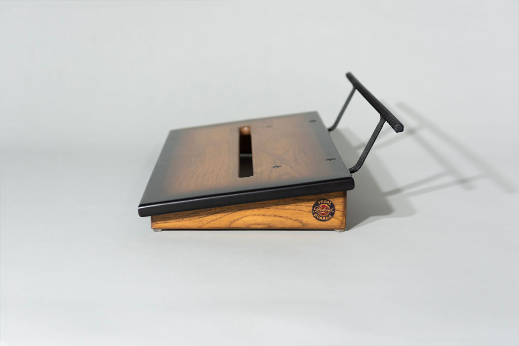 A 12” deep Ash slanted pedal board in either 18” or 24” length in a Saddle Brown Tri-Color Burst Matte finish with a Midnight Black Rebar handle.