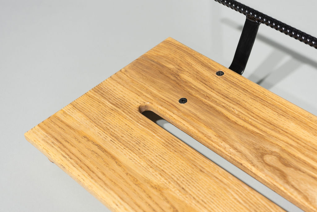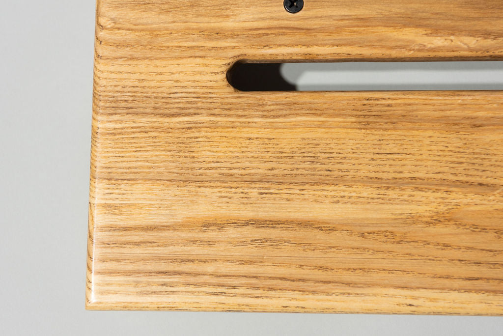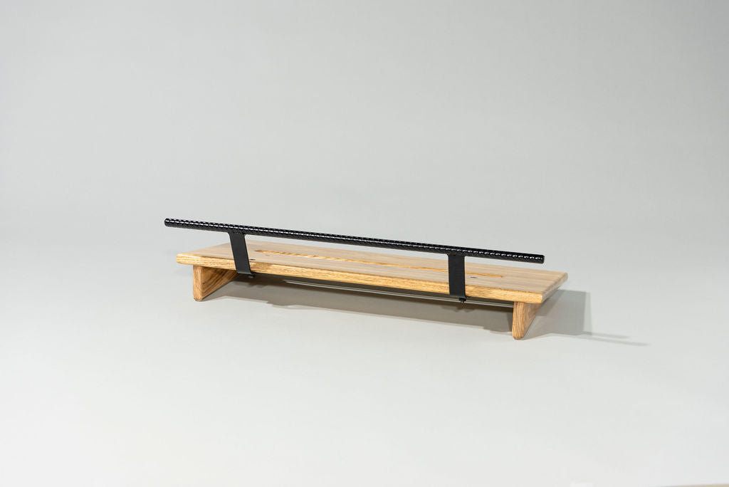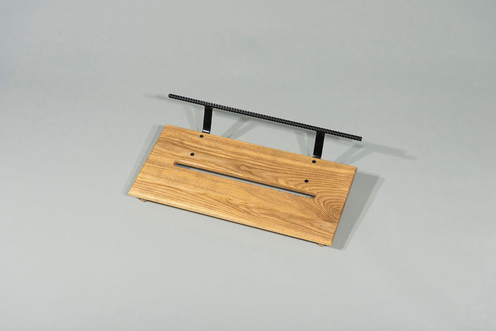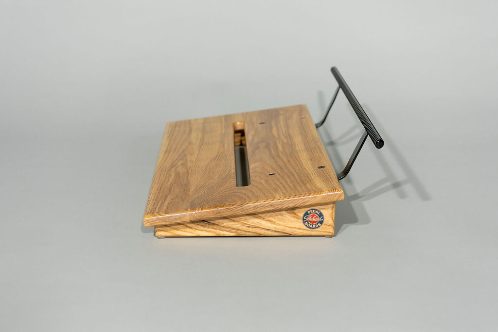 A 12” deep Ash slanted pedal board in either 18” or 24” length in a Natural Gloss finish with a Gloss Black Rebar handle.