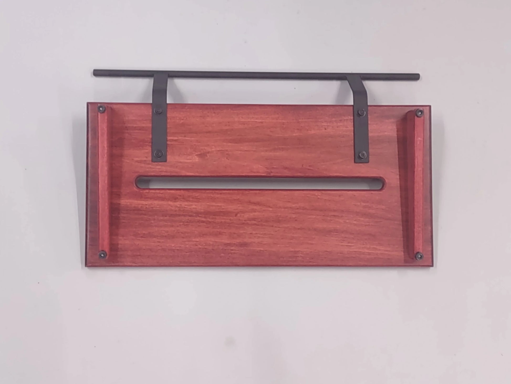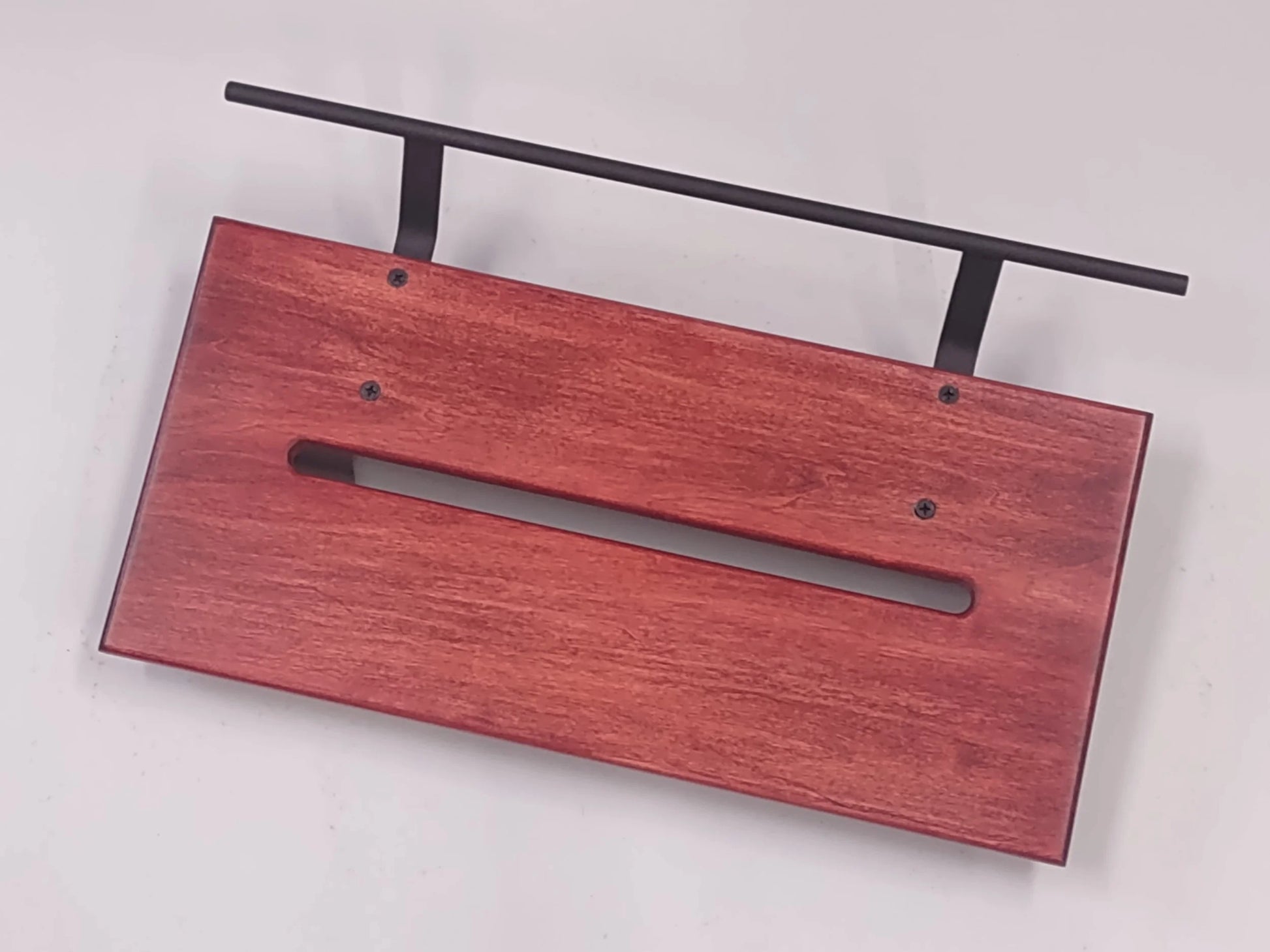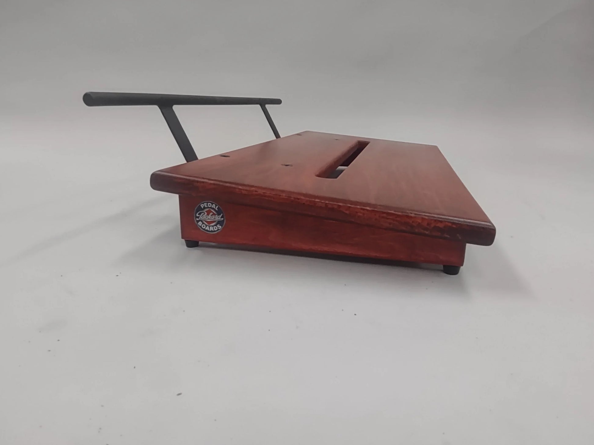A 12” deep by 24” wide Poplar slanted pedal board in a Transparent Red matte finish with a Midnight Black powder coated round handle.