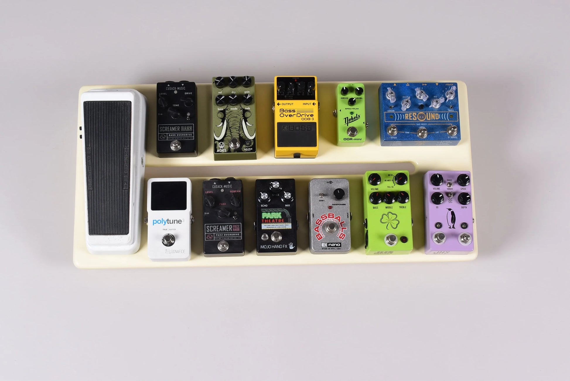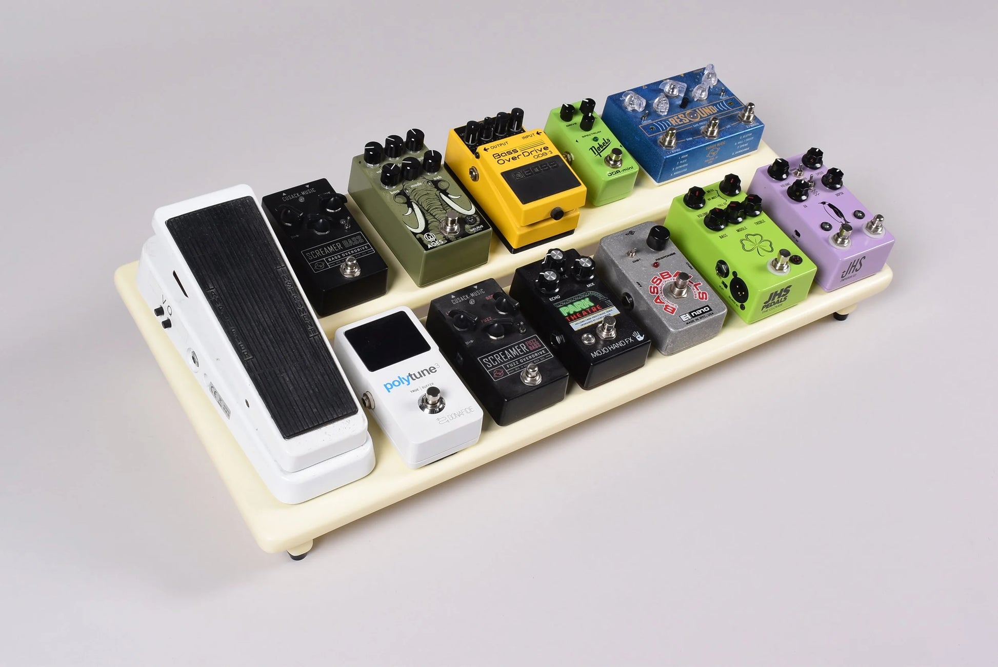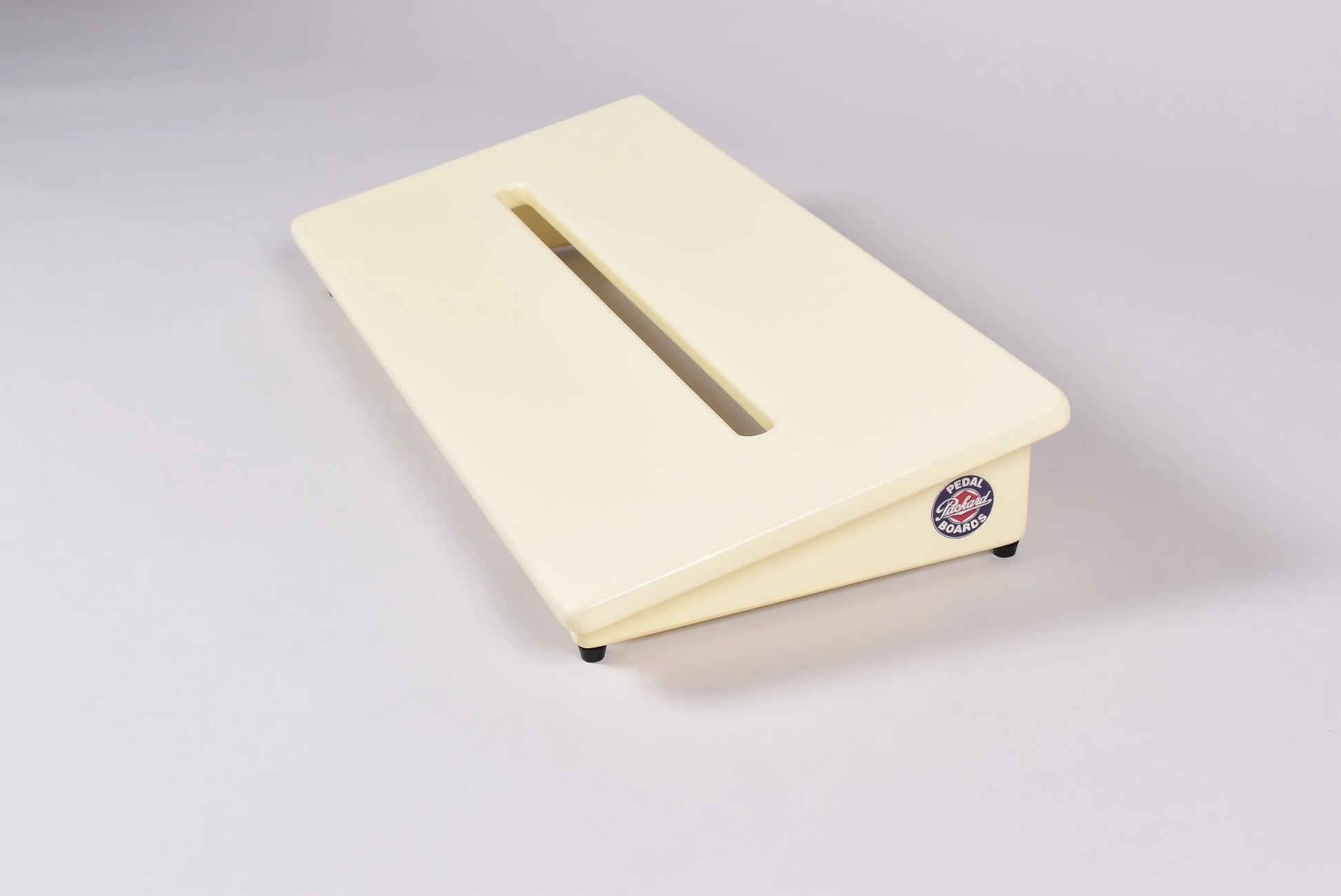 A 12” deep Poplar slanted pedal board in either 18” or 24” length in a Vintage White Satin Gloss 2K urethane finish.