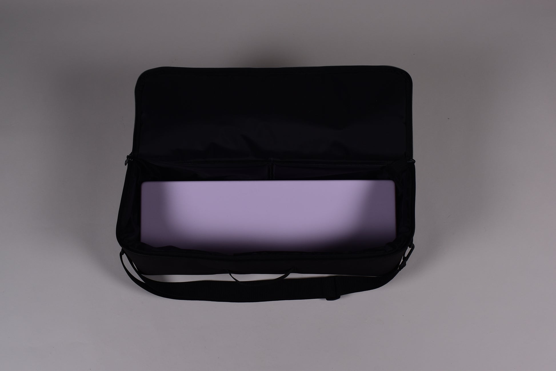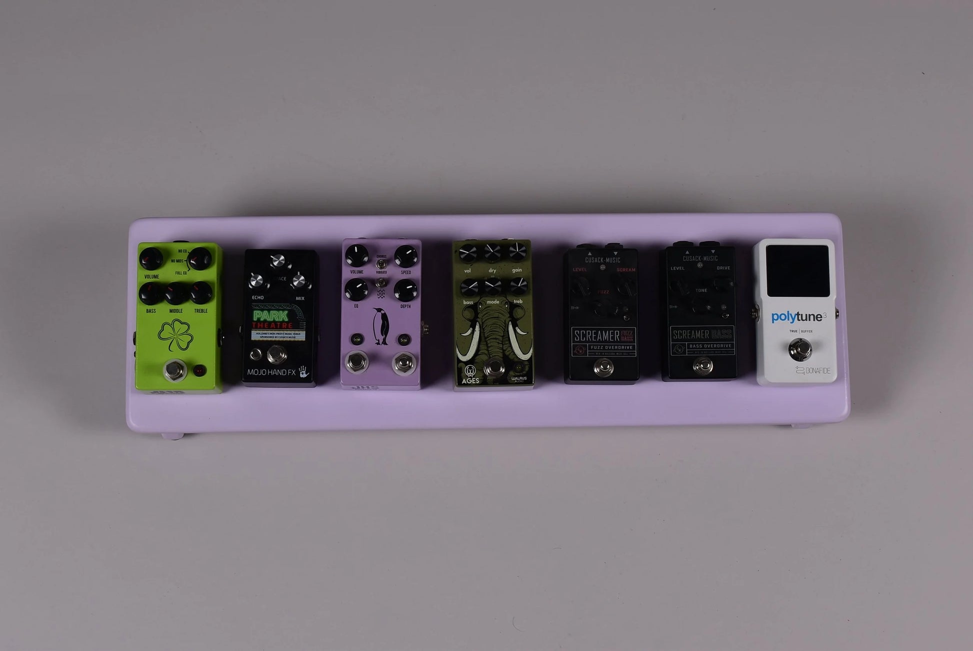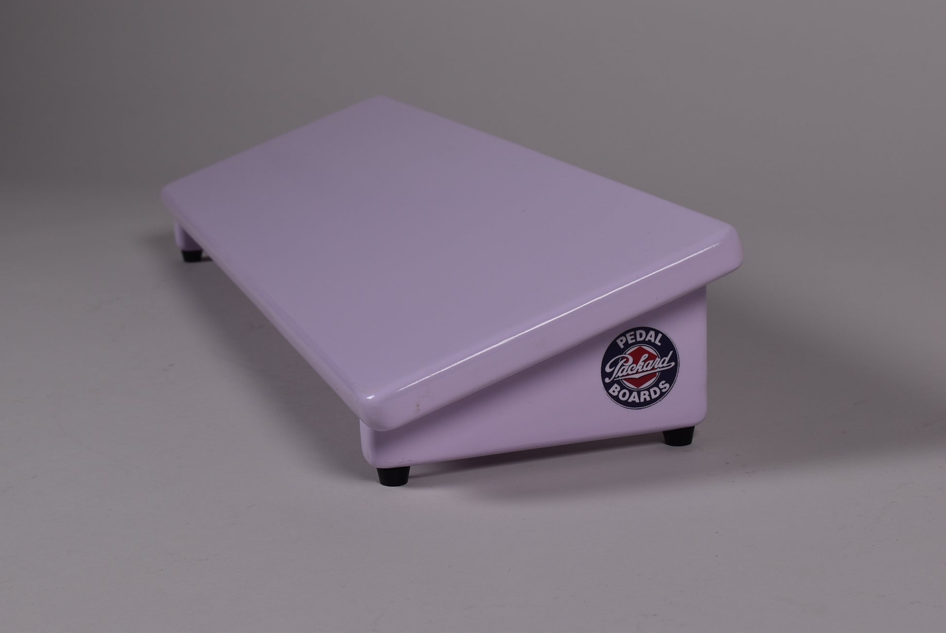 An 8” deep Poplar slanted pedal board in either 18” or 24” length in a Lavender Purple Satin Gloss 2K urethane finish.
