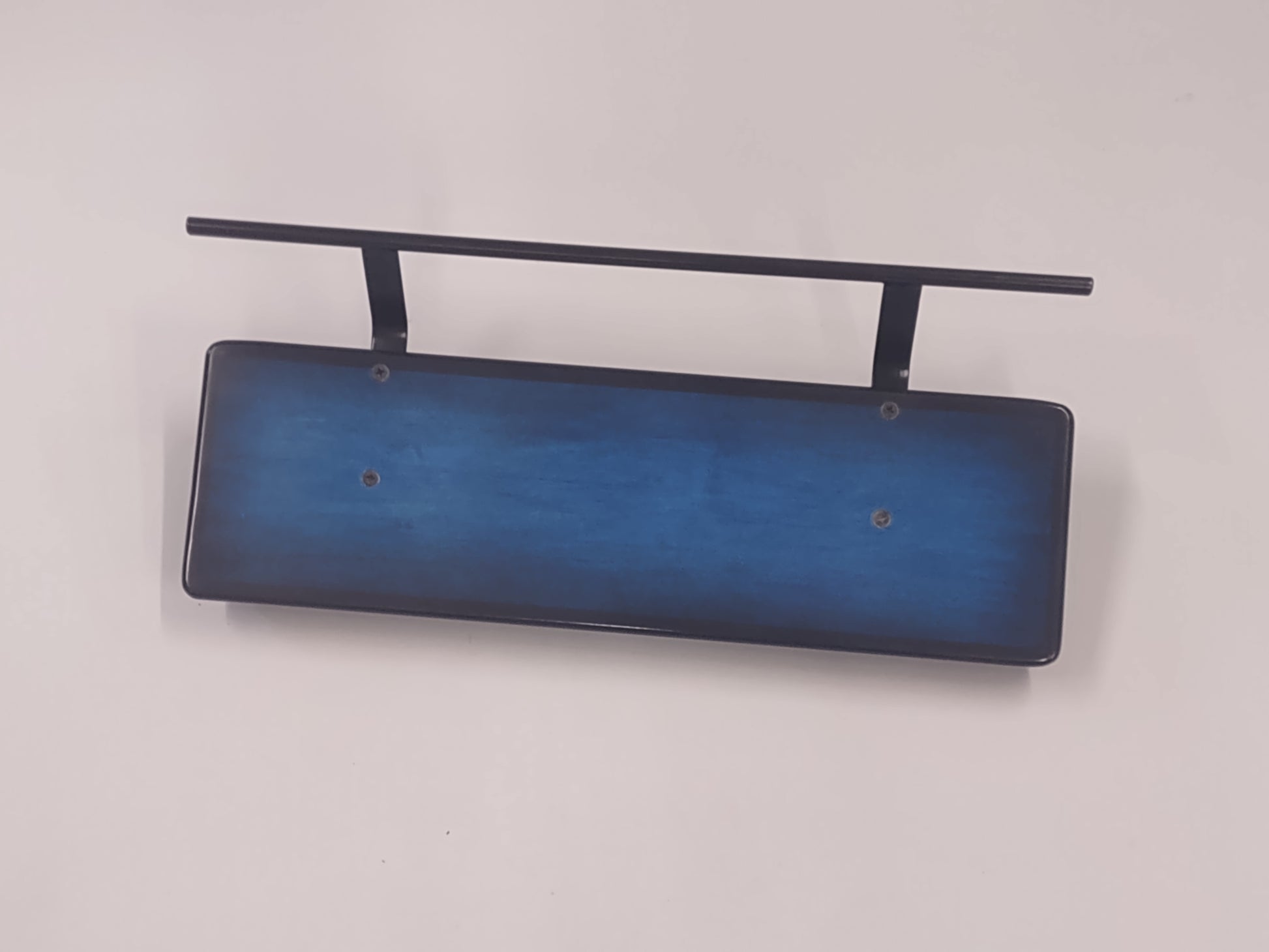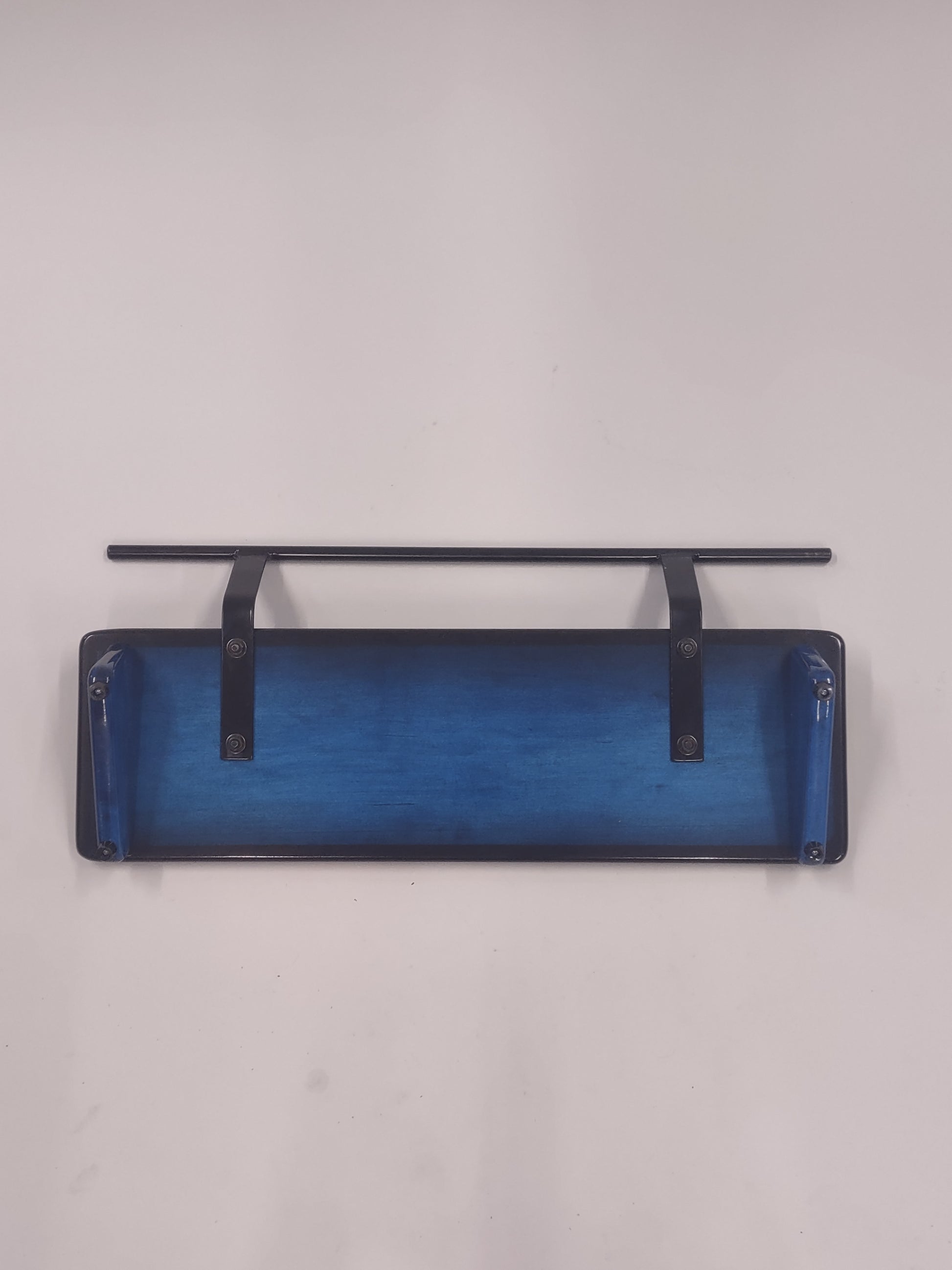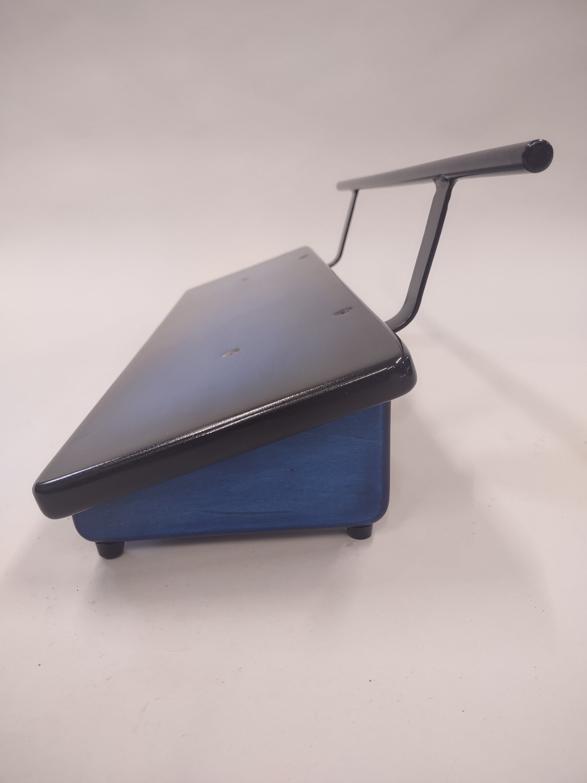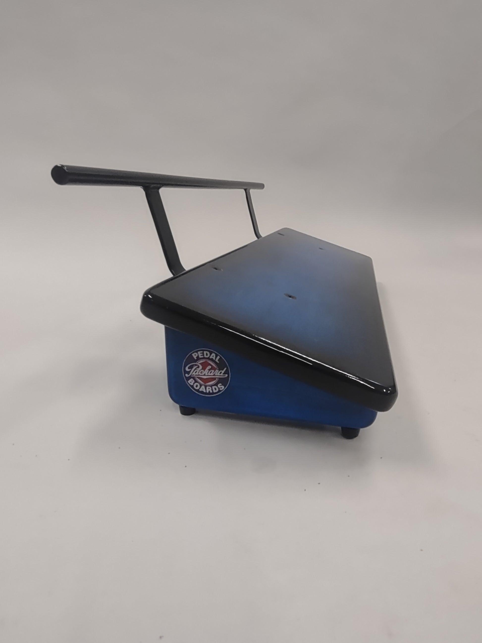 An 8” deep by 24” wide Hard Maple slanted pedal board in a Pacific Blue Burst high gloss finish with a 1/2” Round Gloss Black powder coated handle.