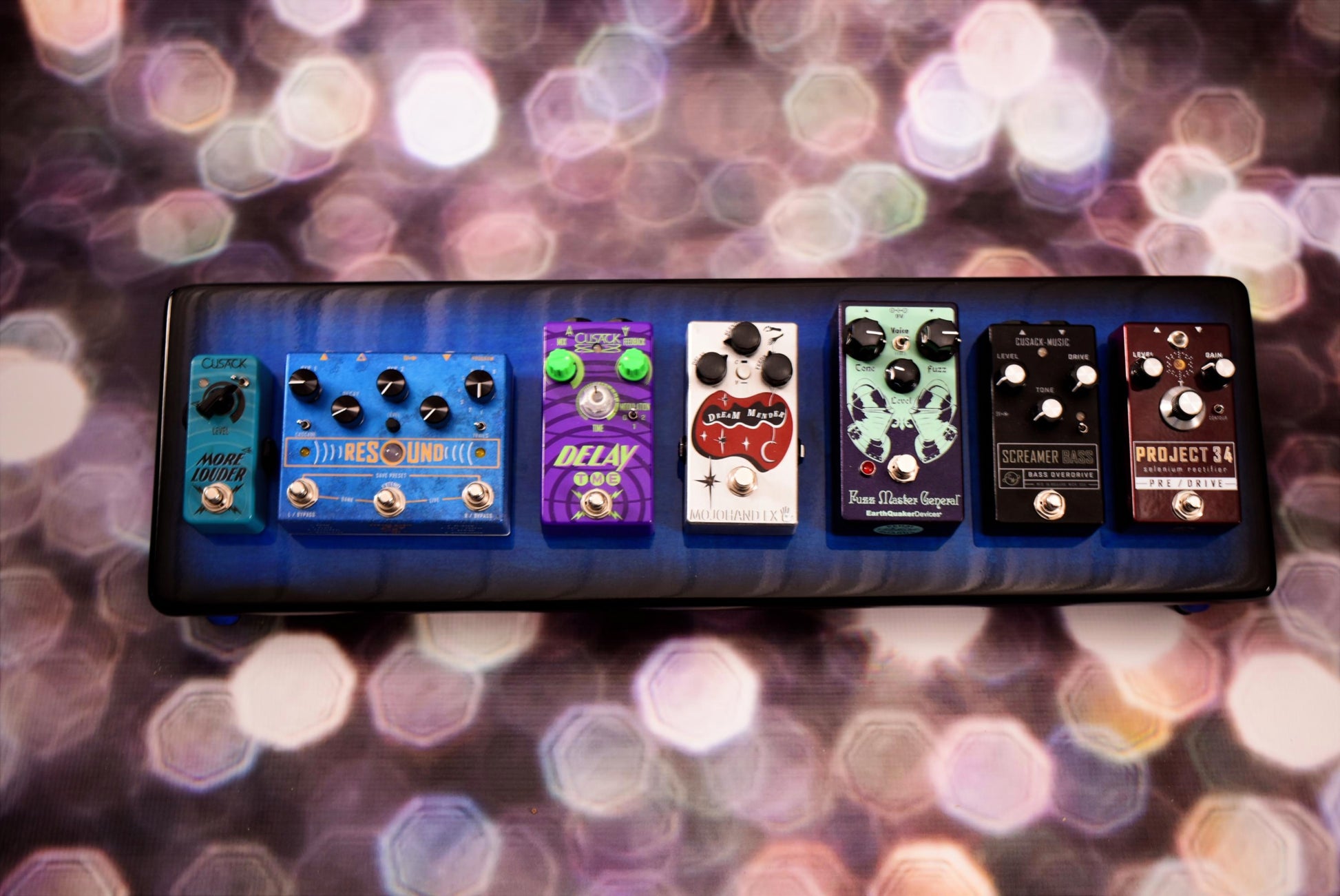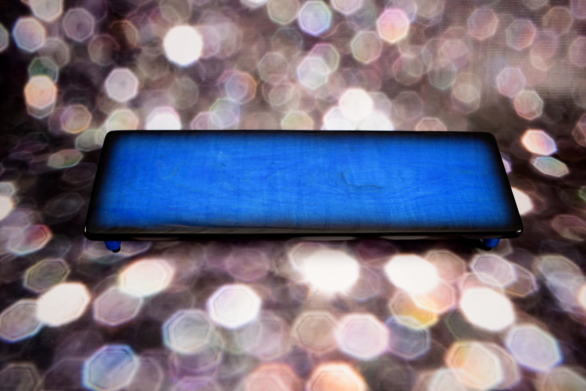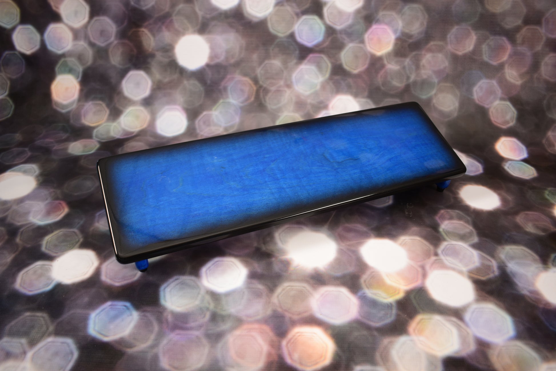An 8” deep Curly Maple slanted pedal board in either 18” or 24” length in a Pacific Blue Burst High Gloss finish.