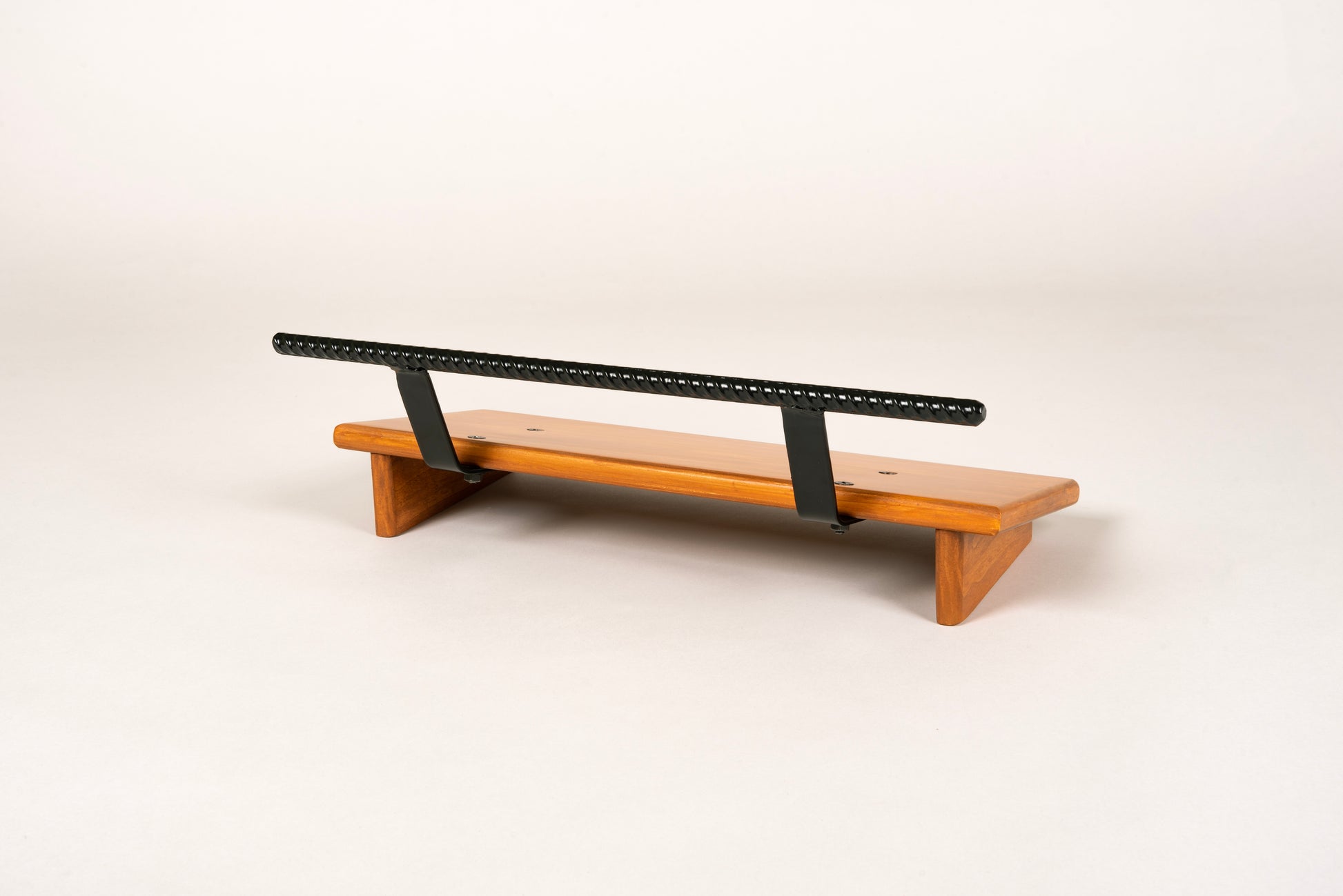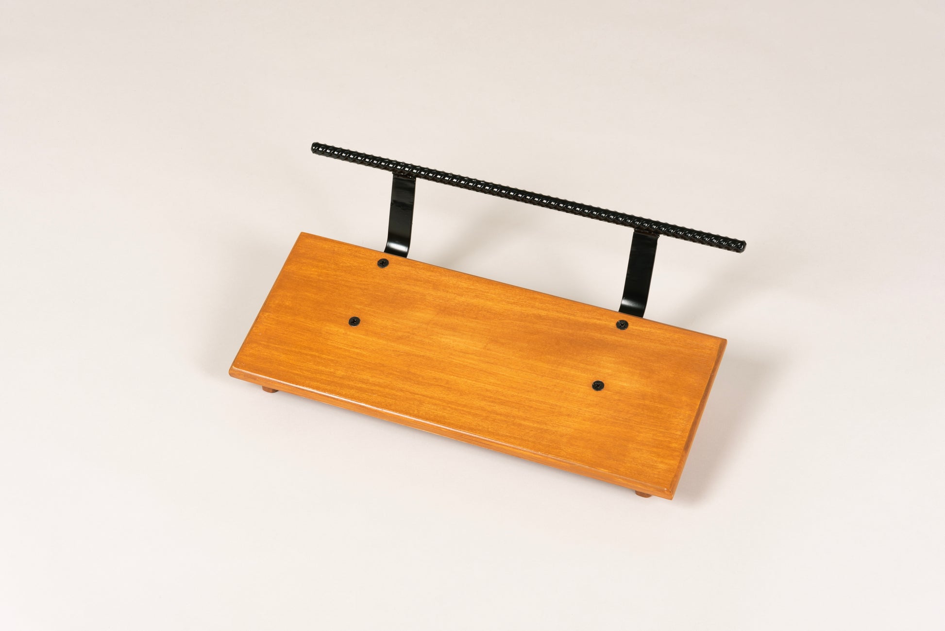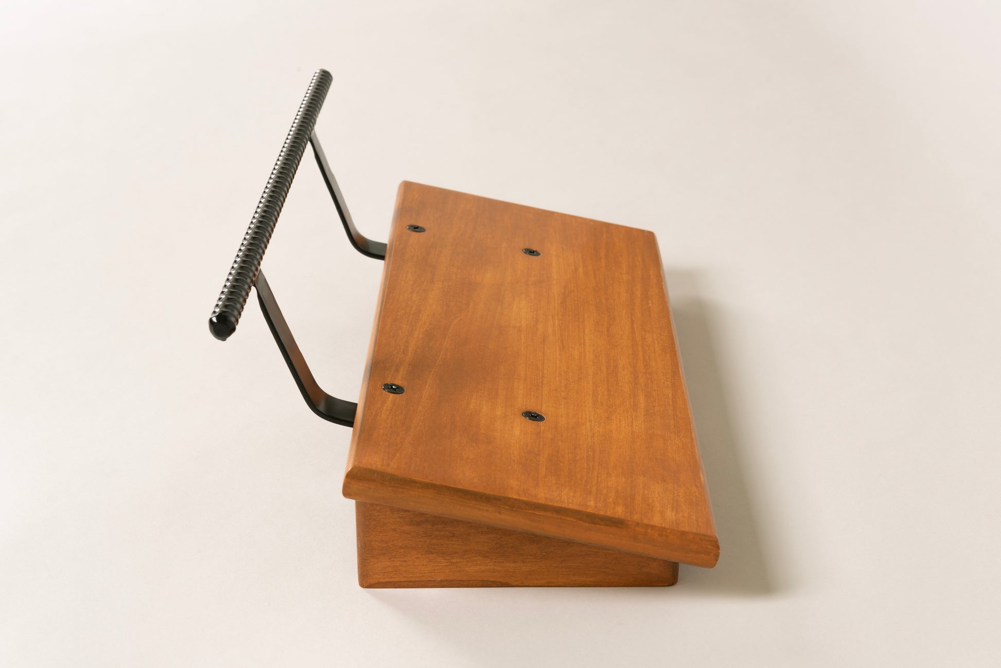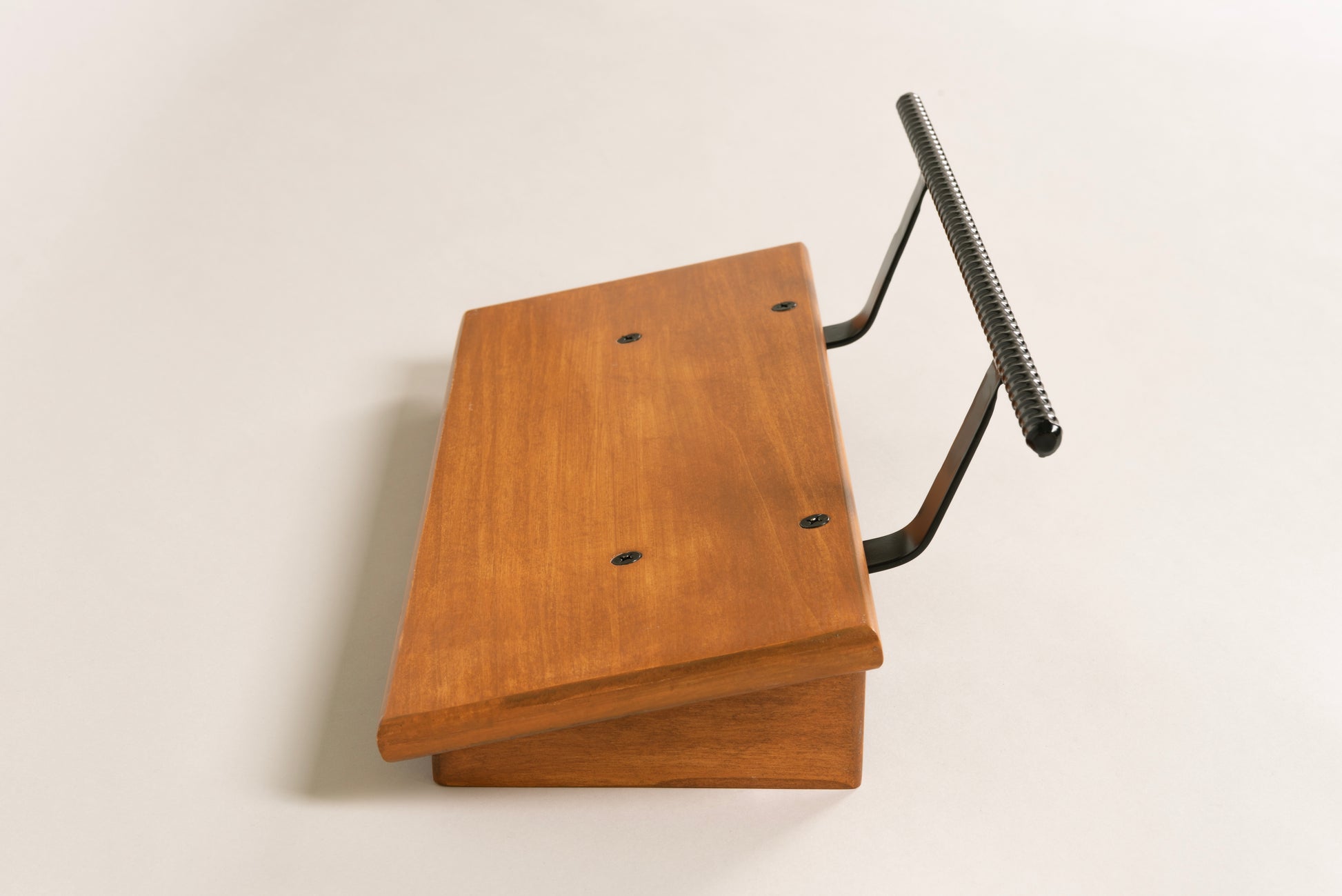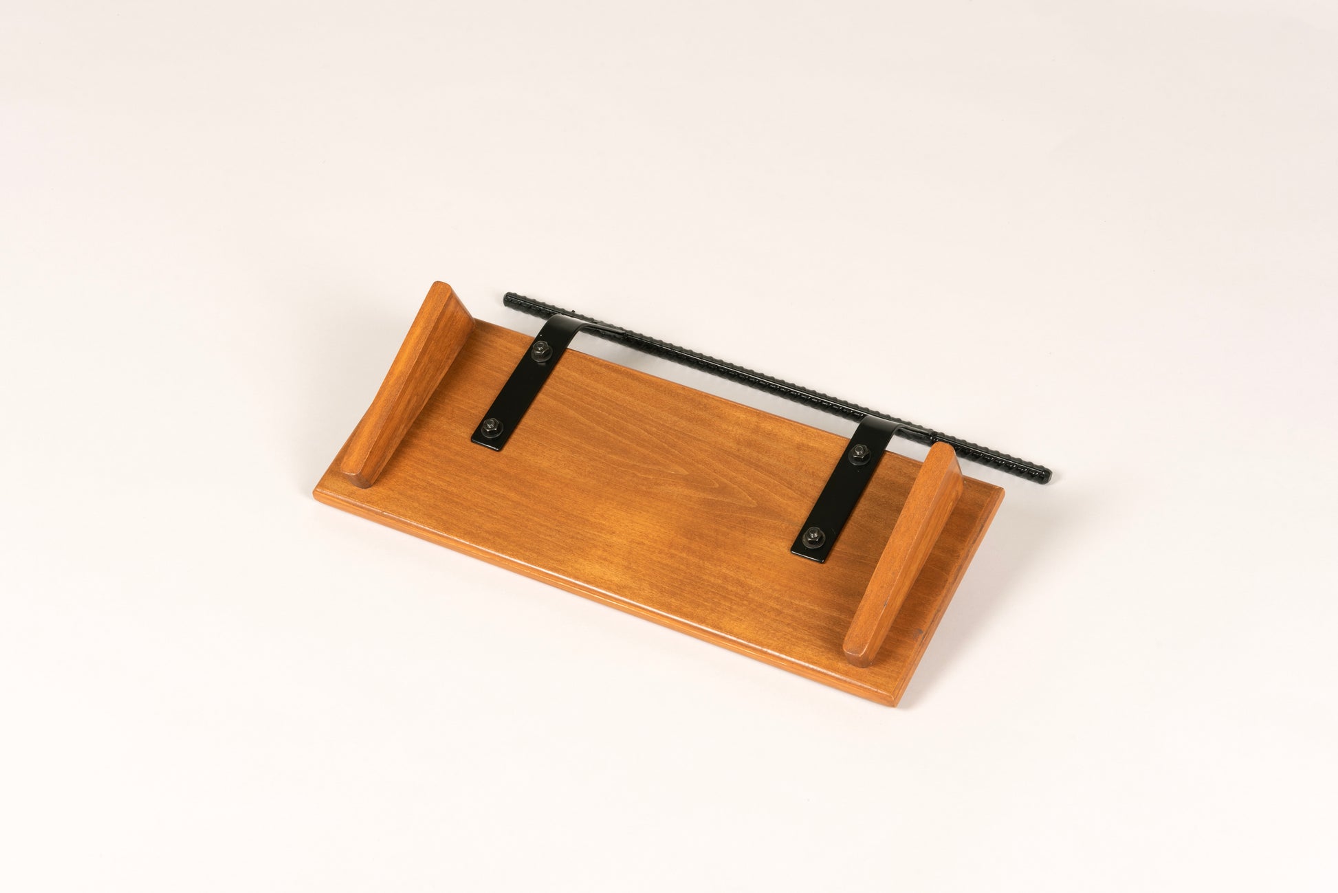 An 8” deep Poplar slanted pedal board in either 18” or 24” length in a Tobacco Brown matte finish with a 1/2” Round carry handle powder coated in Midnight Black.