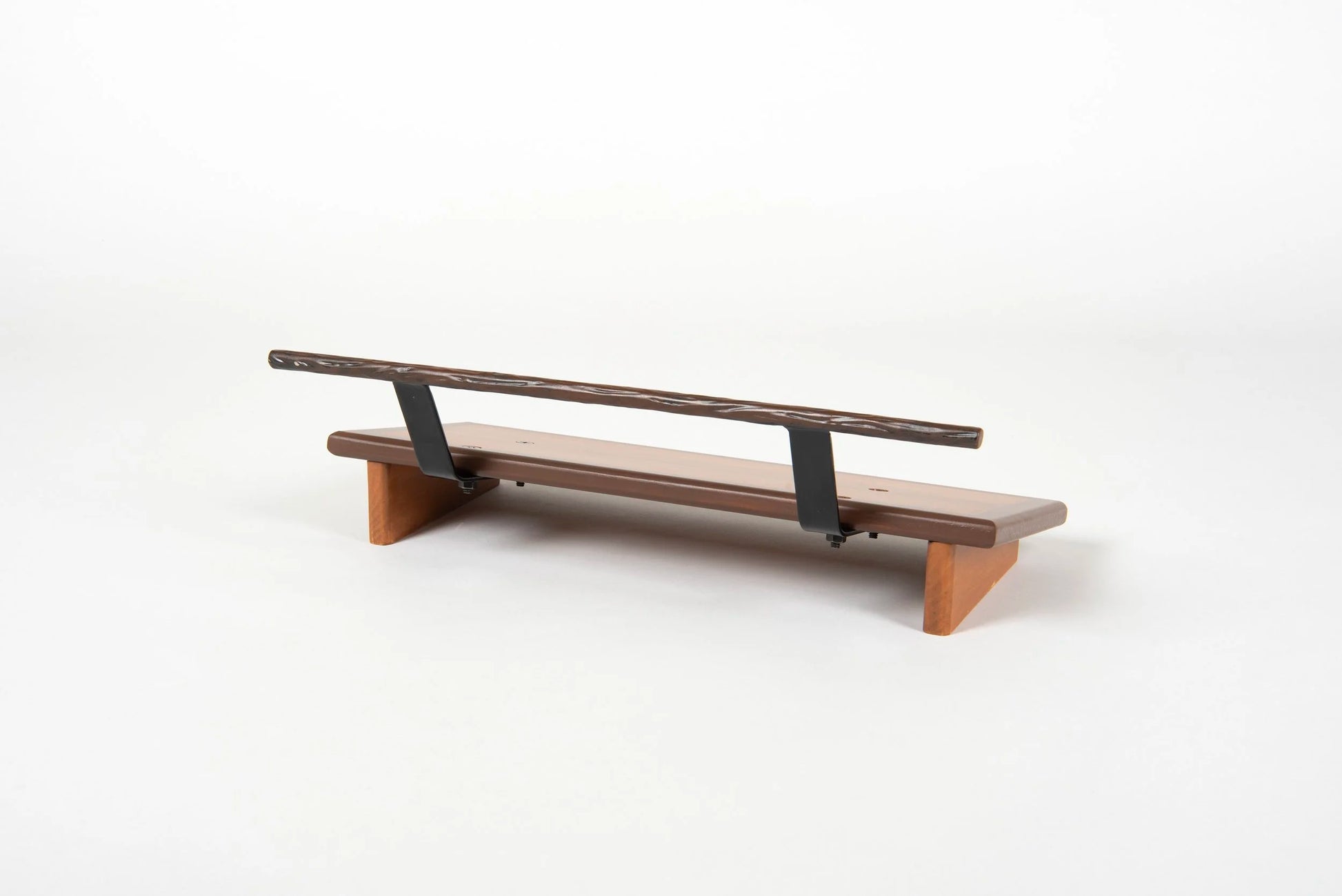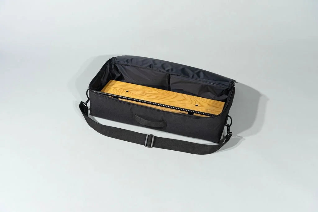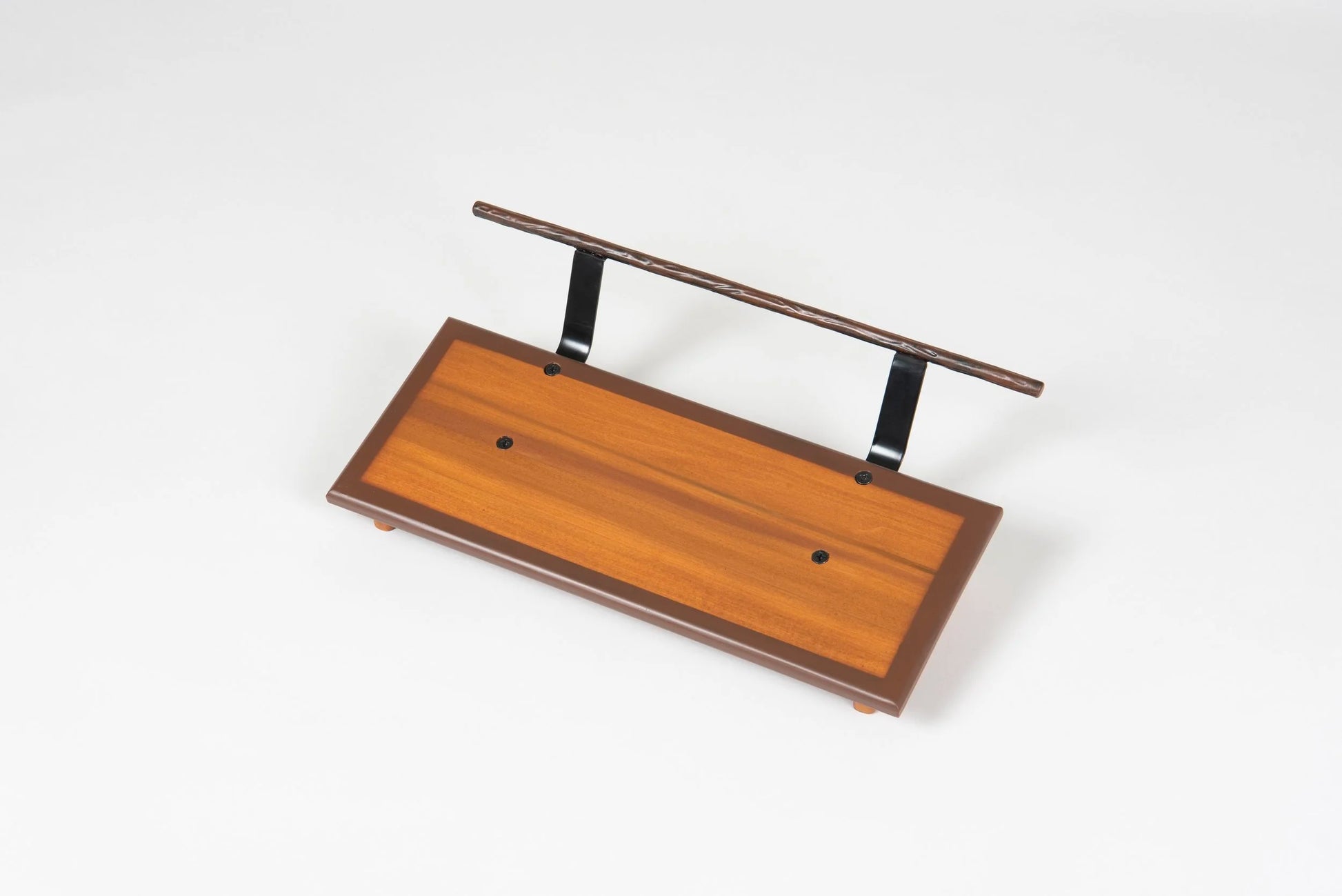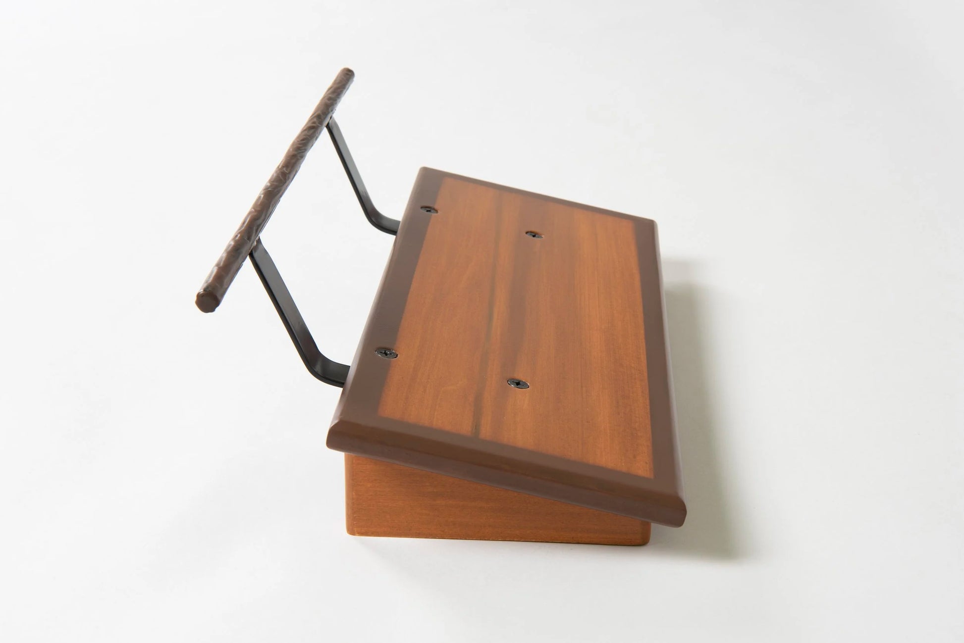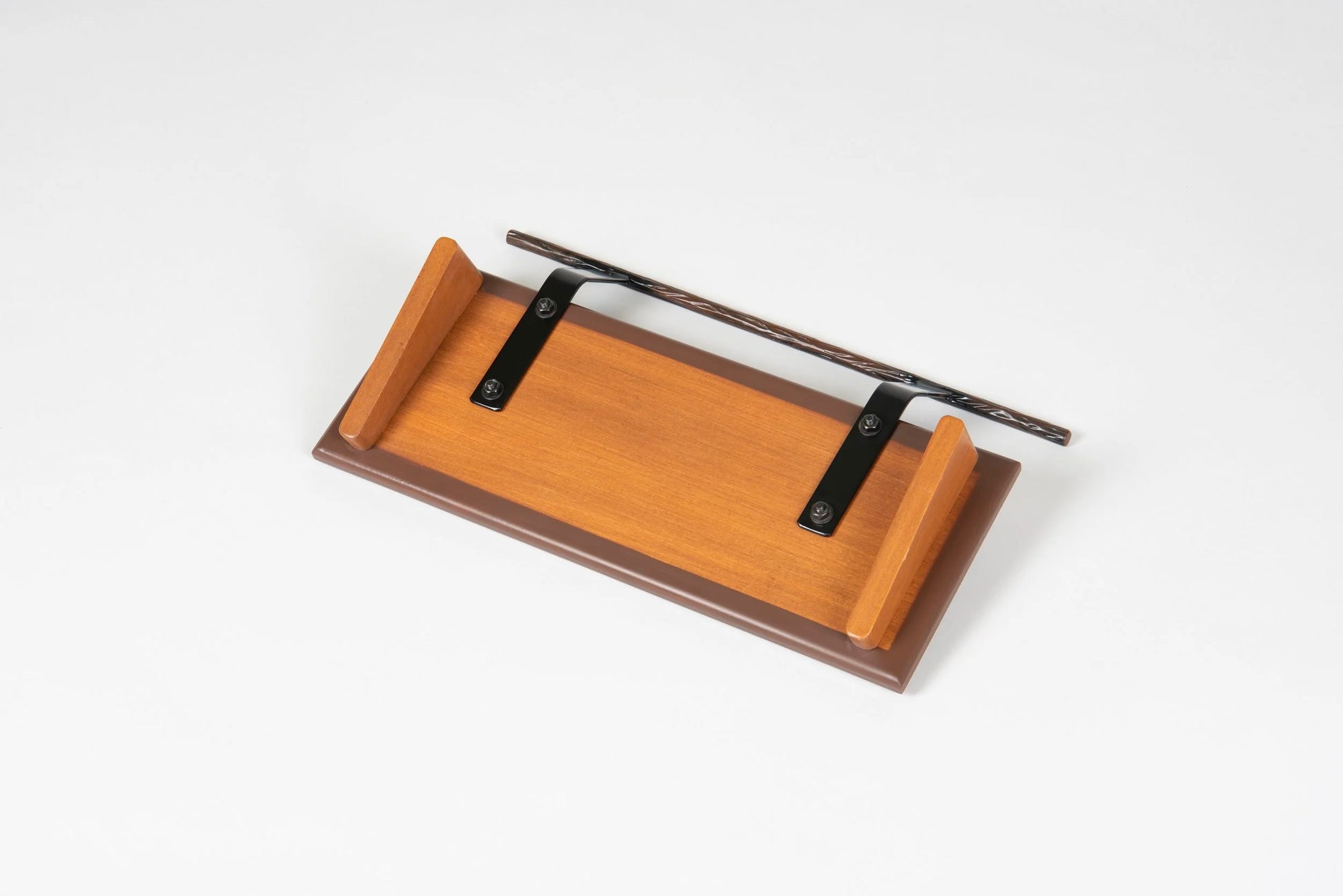An 8” deep Poplar slanted pedal board in either 18” or 24” length in a Tobacco Brown Burst matte finish with a Tree Bark textured powder coated handle.