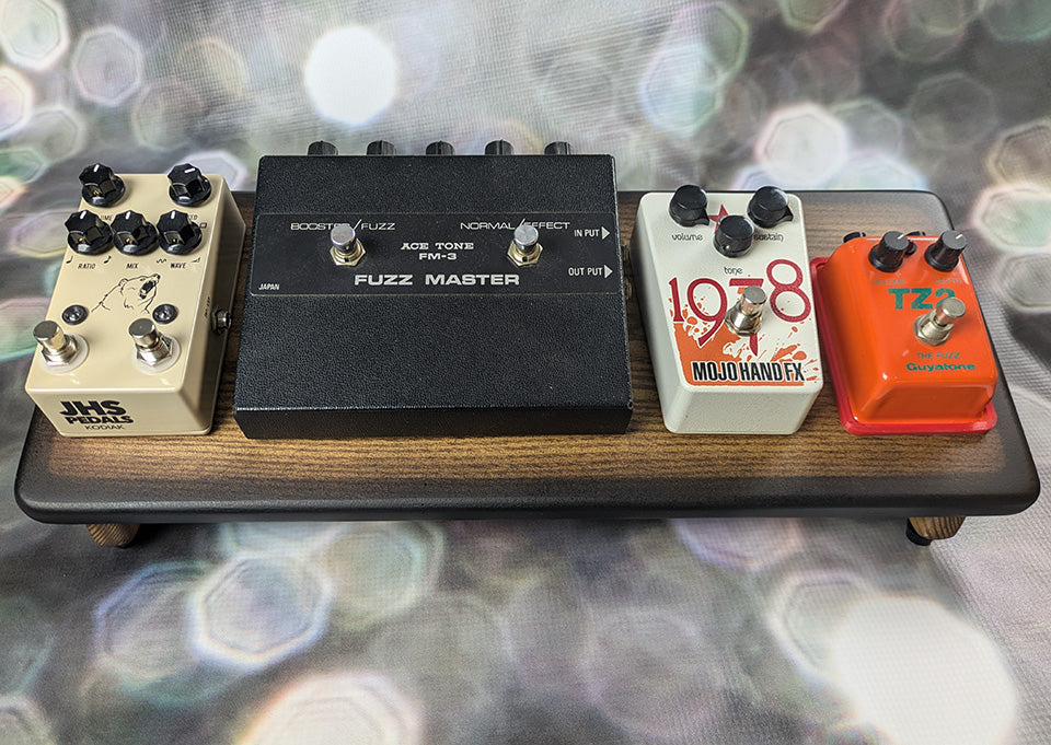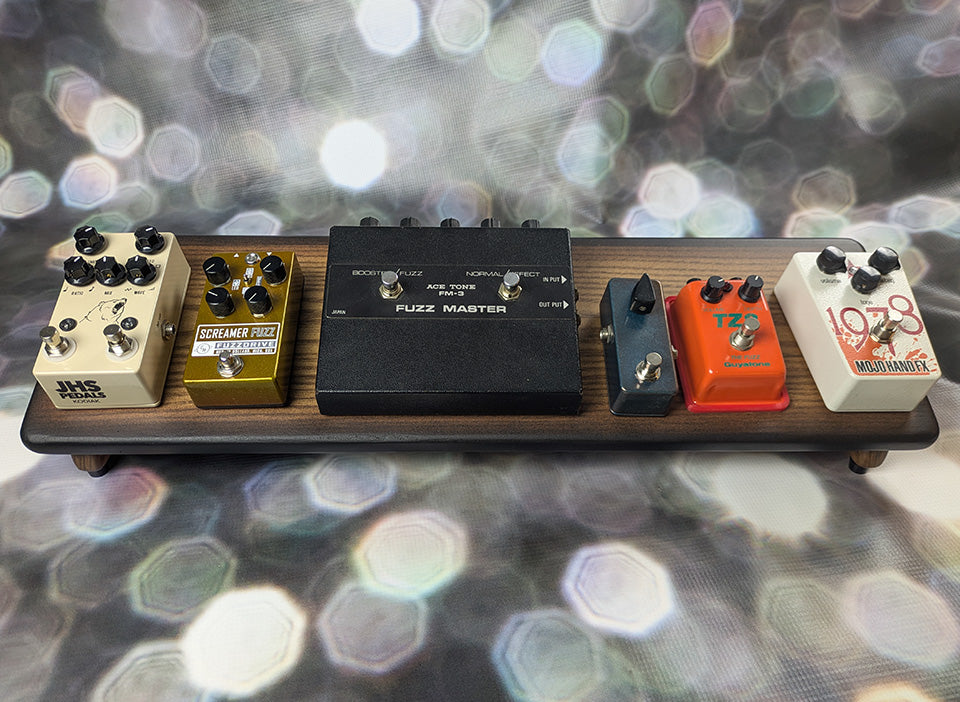 An 8” deep Ash slanted pedal board in either 18” or 24” length in a Saddle Brown Tri-Color Burst matte finish.