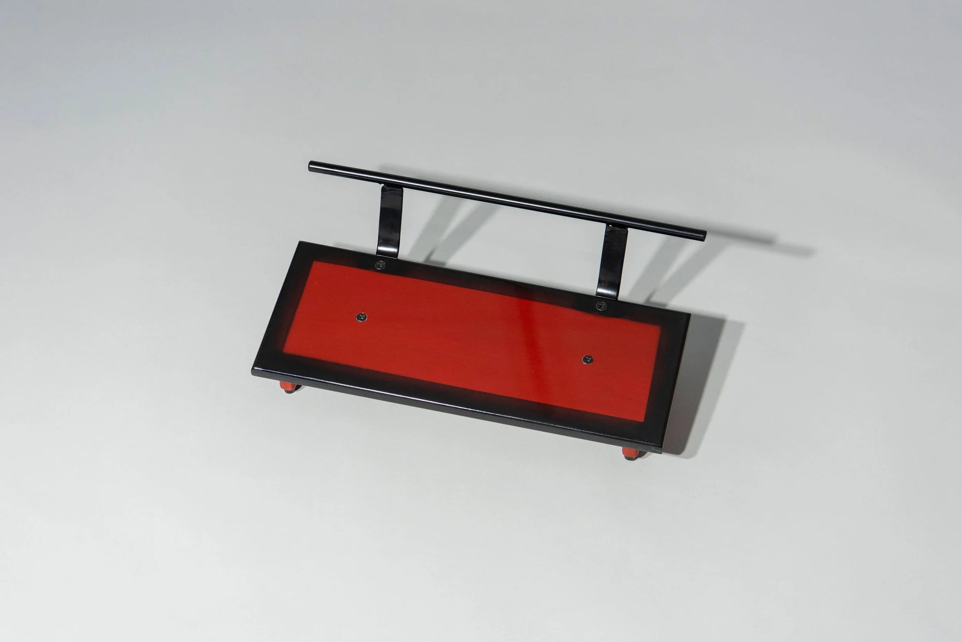 An 8” deep Hard Maple slanted pedal board in a Black Cherry Burst high gloss Acrylic Urethane finish with a 1/2” Round Gloss Black powder coated handle. This is a great feature for carrying in and out of gigs!