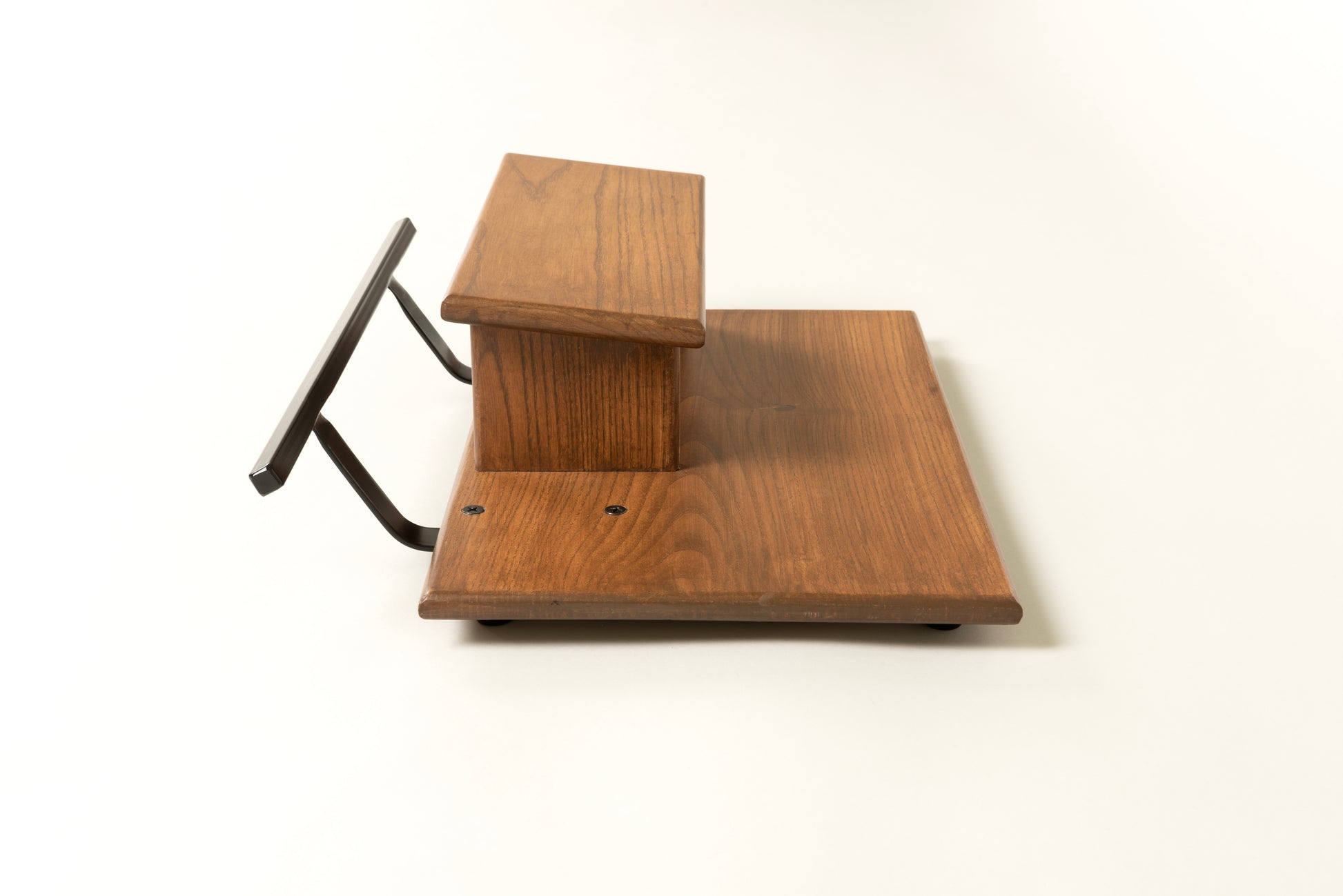 A 12” deep raised deck Ash pedal board in either 18” or 24” length in a Saddle Brown matte finish with a Midnight Black 1/2” Round powder coated handle.
