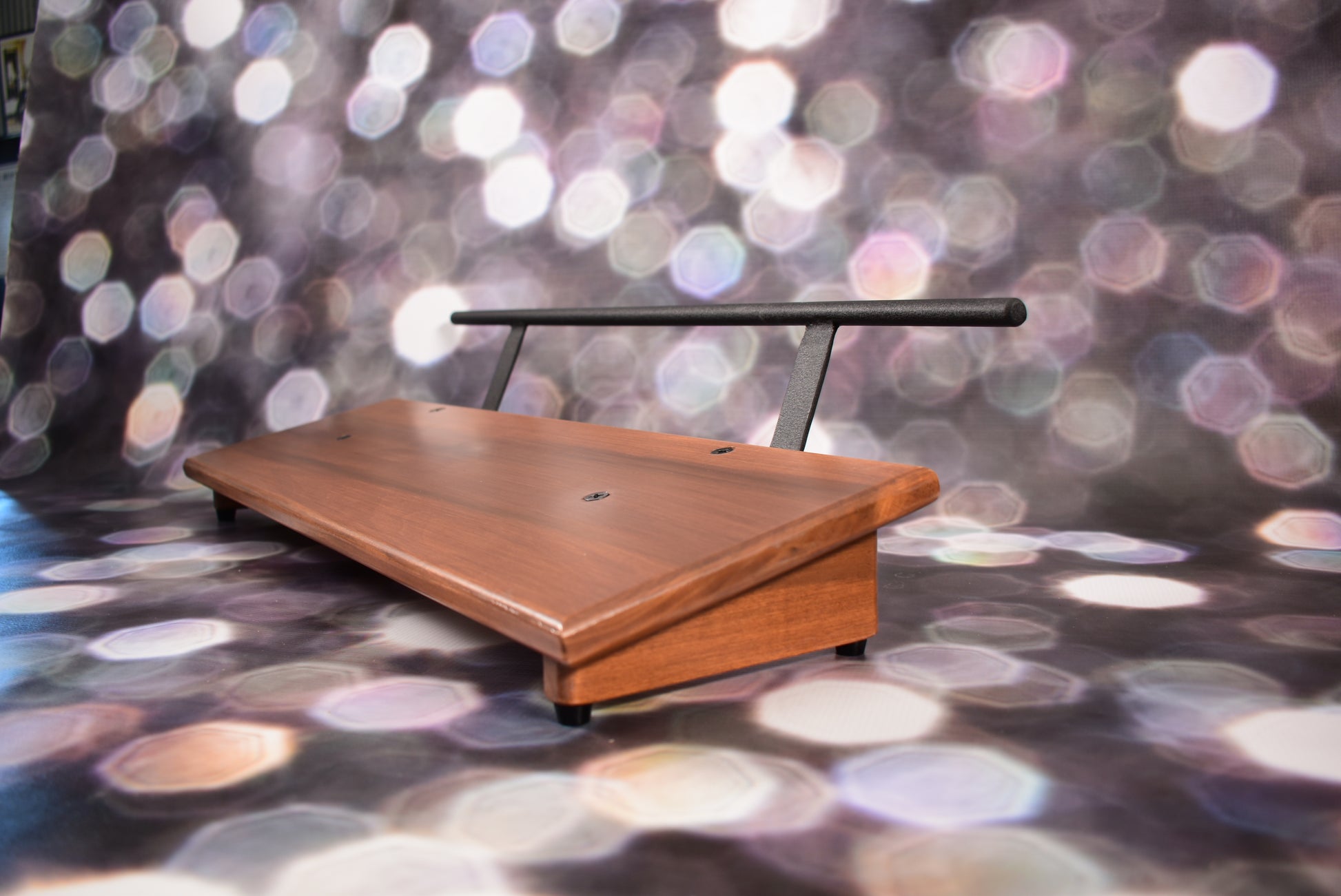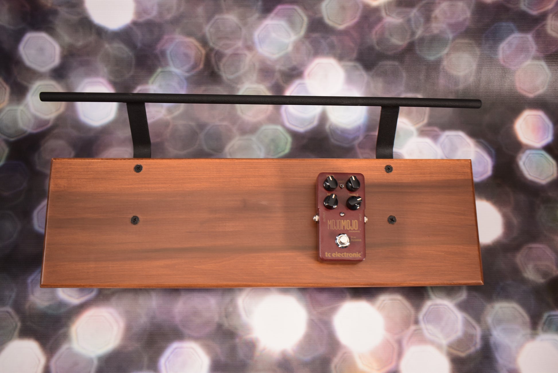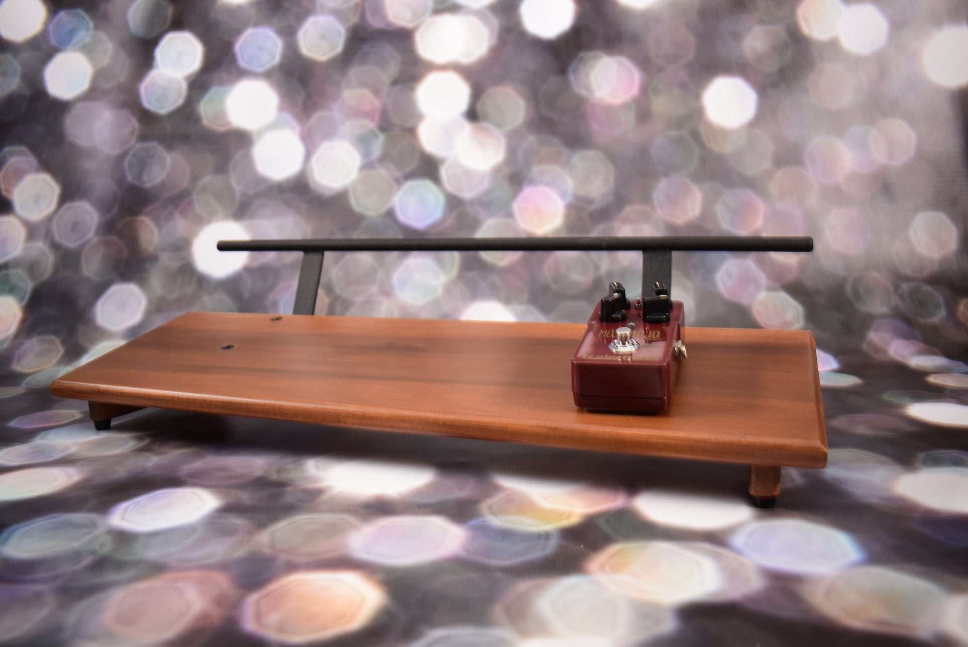A spooky Halloween special! An 8” deep Poplar slanted pedal board in a 24” length with a Tobacco Brown matte finish and 1/2” Round carry handle powder coated in Midnight Black. The 24" length board will accommodate 6-8 pedal easily, and you can mount your power supply unit underneath. This board comes with a used MojoMojo overdrive pedal. This is a great transparent overdrive and sounds amazing on bass guitar. Get this at a super low special price of 40% off and a Overdrive pedal. Only one available so when its gone, it's gone.